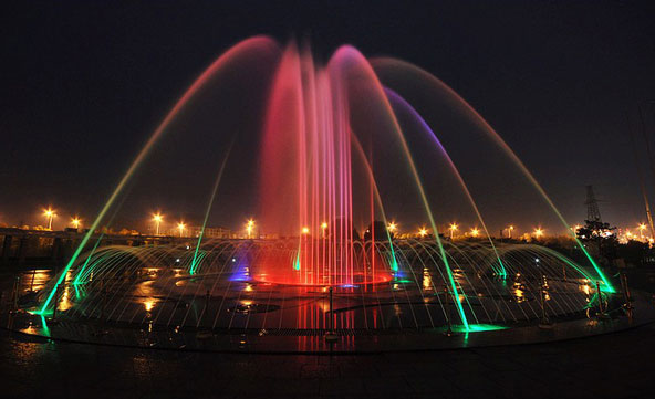 噴泉是富于動態(tài),集聲、光、色、形于一體的設(shè)施。其中,光與色是同步產(chǎn)生和消失的,色必須通過光束才能表現(xiàn)出來。因此,應(yīng)將色與光同時考慮,統(tǒng)一安排。