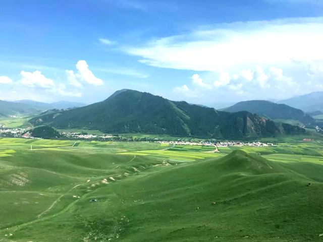 在7、8月份,高山牧場的野花把草原點(diǎn)綴得五彩繽紛,如綢似錦;數(shù)不盡的牛羊膘肥體壯,若隱若現(xiàn);成片的油菜花在湖邊肆意開放,藍(lán)天白云映襯下的金黃、嫩綠,打造出一片絕美的曠世風(fēng)景。