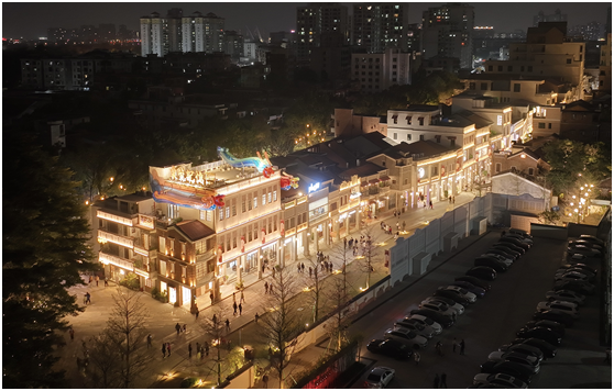 當(dāng)暮色降臨,東莞記憶的街巷褪去白晝的喧囂,一場(chǎng)跨越時(shí)空的光影對(duì)話悄然開(kāi)啟。青磚黛瓦的騎樓在暖金色燈帶的勾勒下舒展身姿,麻石街道被柔和的壁燈映出歲月的肌理,龍舟競(jìng)渡的圖騰投影在波光粼粼的河岸,與遠(yuǎn)處CBD的霓虹遙相輝映……這里,是東莞記憶首開(kāi)區(qū)的夜晚,亦是揚(yáng)光照明以光為筆、以文化為墨,為城市譜寫(xiě)的璀璨篇章。