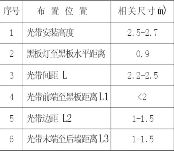 2.布置規(guī)律:.黑板燈平行于黑板、課桌燈垂直于黑板布置,相關(guān)布置尺寸參見表2。特殊情況應(yīng)以照度計算為準(zhǔn),例如美術(shù)教室教室的照度標(biāo)準(zhǔn)為500lx,光帶間距可能調(diào)整至1.8-2 米。